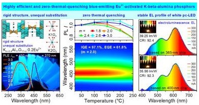 名义组成Km-0.4Al11O17+δ:0.2Eu2+荧光粉实现了高效、零热猝灭蓝光发射,这得益于空间群为P63/mmc的刚性铝酸盐结构和陷阱能级的引入。最佳样品K1.6Al11O17+δ:0.2Eu2+的内、外量子效率分别为97.1%和61.8%。荧光粉在150 °C内表现出零热猝灭行为。进一步增加K含量会导致更好的热稳定性,但会降低量子效率。论文讨论了发光特性与晶体结构的关系。结果表明,该蓝色荧光粉可作为基于近紫外或紫色芯片的白色荧光粉转换LED的候选材料。